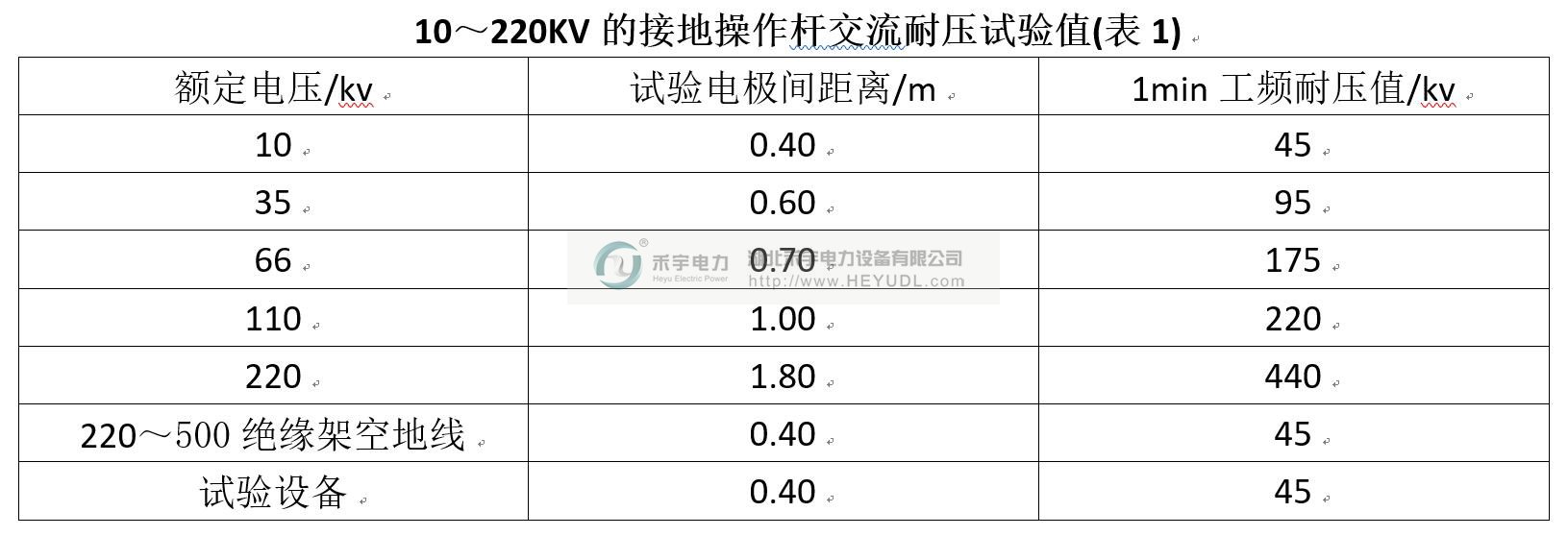 工頻耐壓試驗:對10~220KV的接地操作桿進行工頻耐壓試驗時,加壓時間保持1min,其電氣性能應(yīng)符合表1的規(guī)定。儀無閃絡(luò),無擊穿、無明顯發(fā)熱為合格。